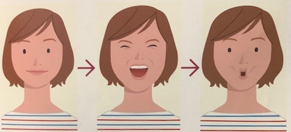 ②口を丸く開き、目が三日月になるくらい頬を持ち上げ、「あー」と5秒間声を出す。